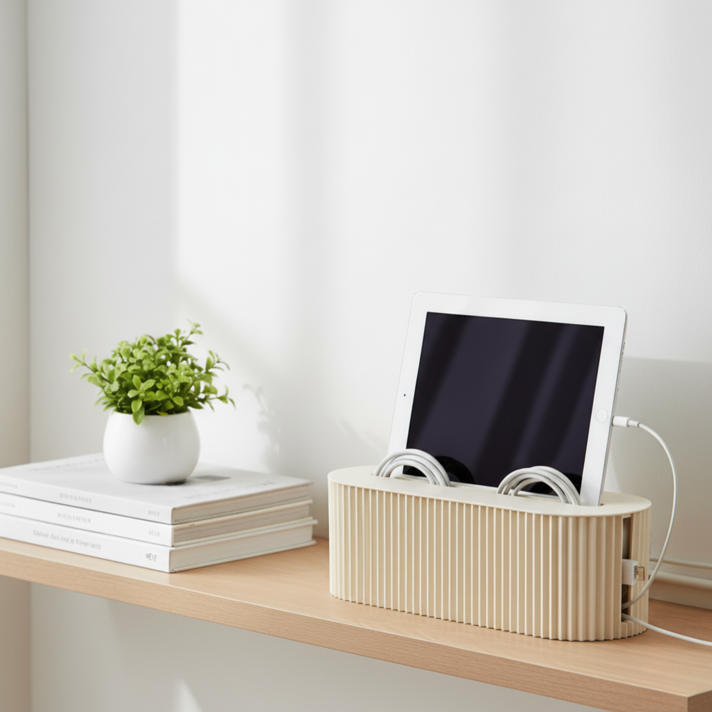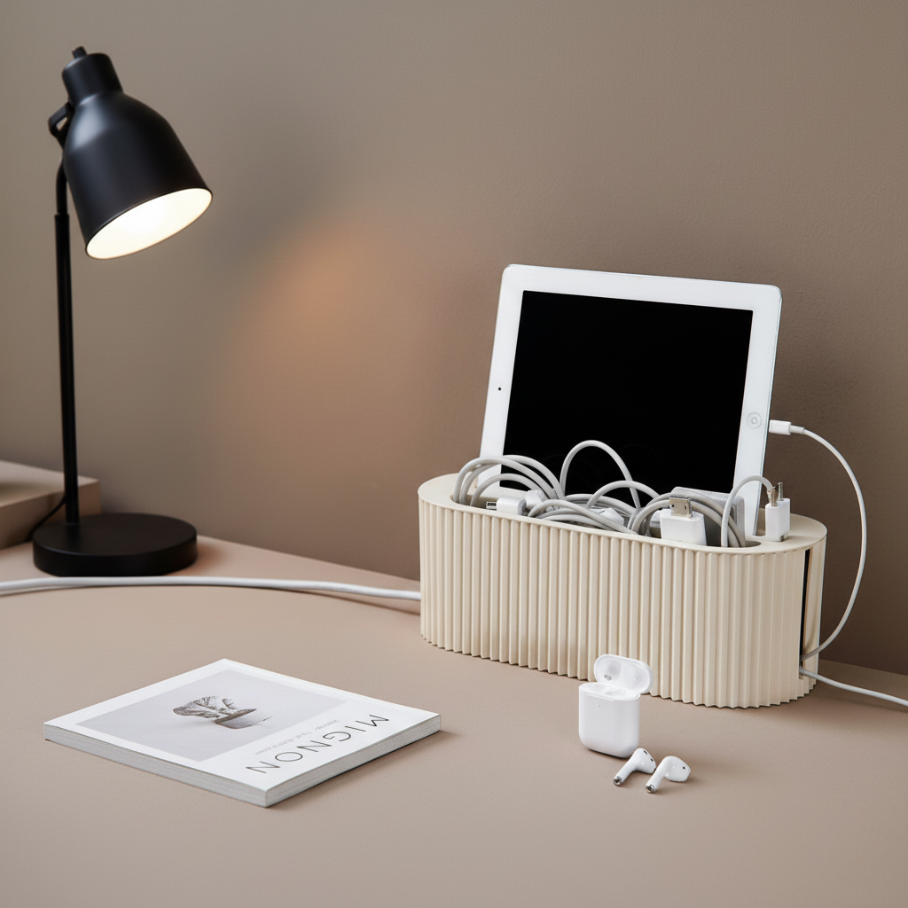 La NeatBox est une solution de rangement pour les équipements électroniques de bureau. Elle est conçue pour dissimuler les multiprises, chargeurs et câbles, contribuant à un espace de travail ordonné.